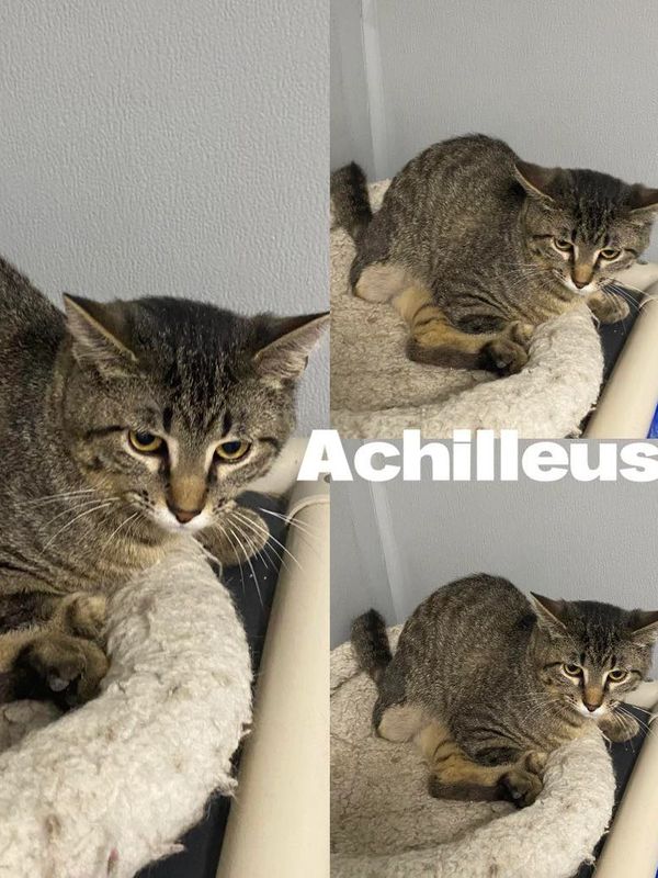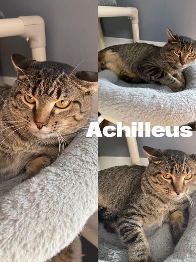 He was born around 10/7/24. This gorgeous tabby came to us dragging his whole hind end. We were fearful of his prognosis. However, he is a tough fighter. He has had his back shattered leg removed and his pelvic bone is healing from fracture.